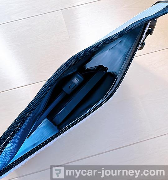 発送中の不慮の事故を防ぐための防火ポーチが同梱されており、ポーチにモバイルバッテリー本体を入れて封をしました。