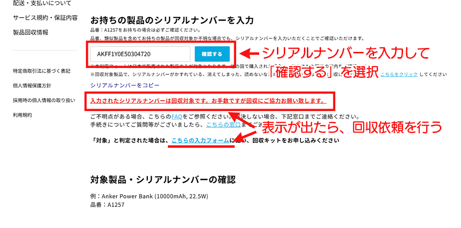 「自主回収の対象かどうかを確認する方法」で紹介した通り、型番の確認とシリアルナンバーの入力を行いました。