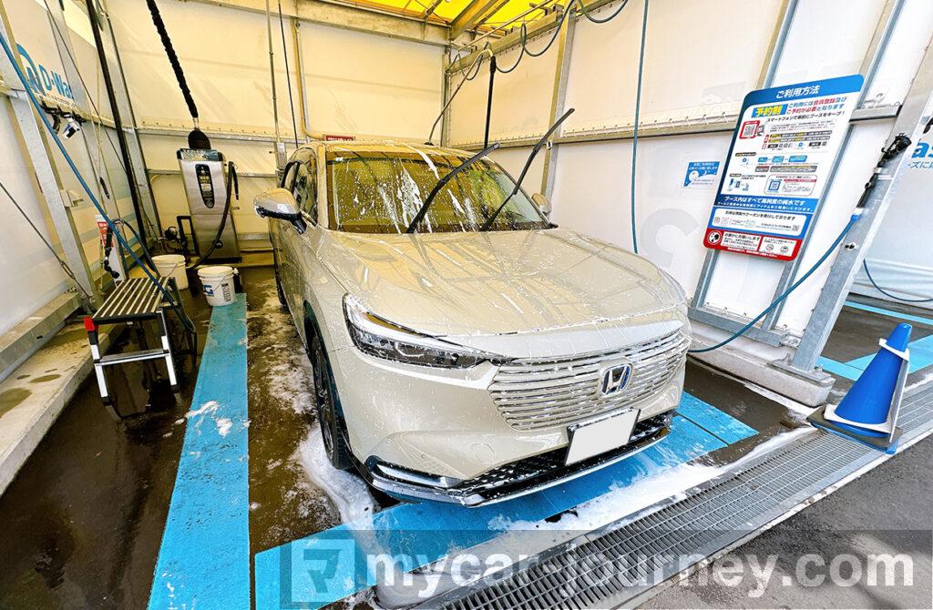 スプレー洗車機の水コースで「洗い」と「すすぎ」を行い、一時停止中にカーシャンプーを使って「手洗い」するのがいつもの流れです。