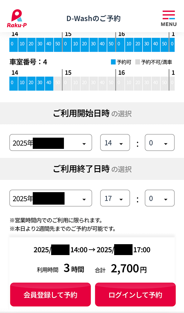 予約や確認は「ラクピー(raku-p)」という駐車場会員サービスを通じて行われるため、初回利用時には会員登録(無料)が必要です。
