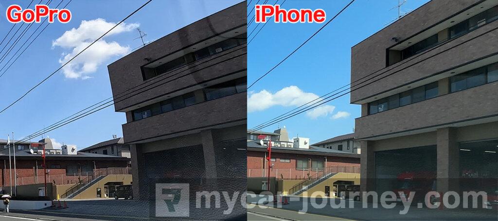 iPhoneは空の色が鮮やかに表現されていますが、GoProは彩度が落ち着いています。