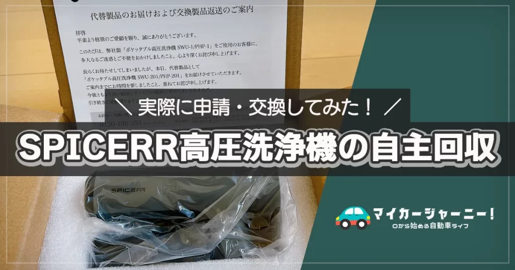 以前、洗車の補助アイテムとして小型のバッテリー式高圧洗浄機を紹介する記事を公開しました。 この「SPICERR ポケッタブル高圧洗浄機」の初期型に自主回収・交換の案内が出ていました。実際に私が購入した機種もこの自主回収の対象に含まれていたため、交...