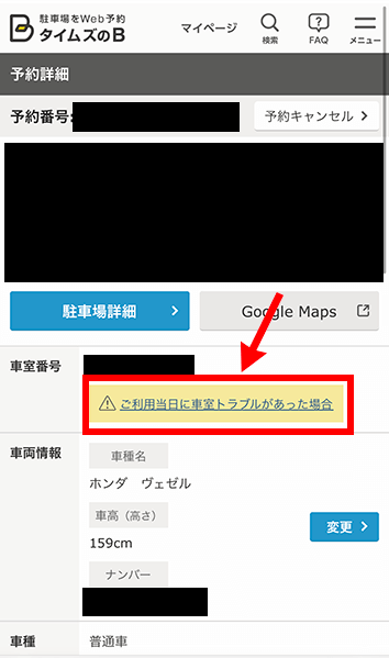 後程詳しく解説していますが、予約確認ページから「車室トラブルがあった際の案内ページ」へ遷移することができます。