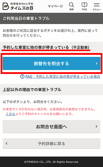 他の車が停まっているトラブルの場合は、「振替先を照会する」を選択します。