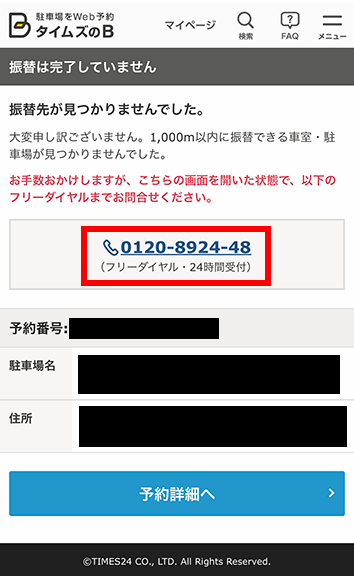 もし近隣に振替できる駐車場が見つからなかった場合は、画面に記載されたコールセンターへ直接連絡します。