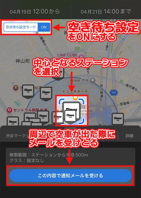 アプリ限定の「空き待ち設定モード」機能は、指定した範囲内のステーションで空きが出た際にメールで通知が届く便利な機能です。
