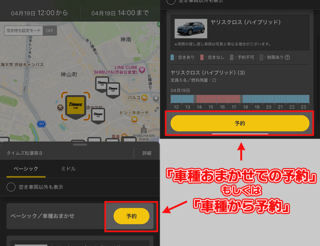 - 無い場合は予約登録画面にある「周辺から空き車両を探す」を選択