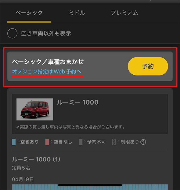 アプリでステーションや車両を選んだ際、画面上に「オプション指定はWeb予約へ」というボタンが表示されることがあります。