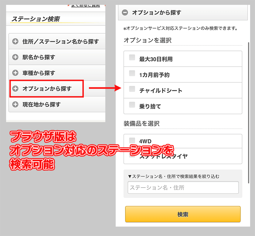 オプション(チャイルドシート・スタッドレスタイヤなど)が利用できるステーションを検索したい場合では、ブラウザ版のほうが検索精度が高く、詳細な設定が可能です。