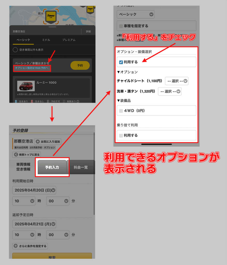 タイムズカーでは、ステーションや車両によって「オプションの選択可否」が異なる場合があります。
