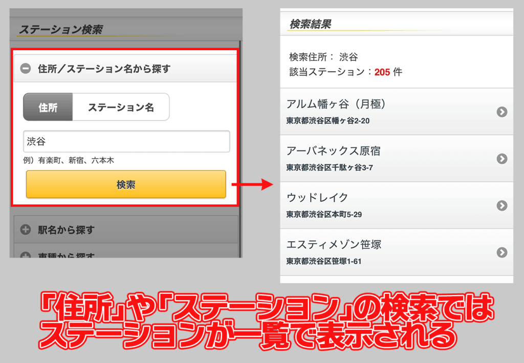 ステーションの検索方法 → 住所や地図検索に違いあり